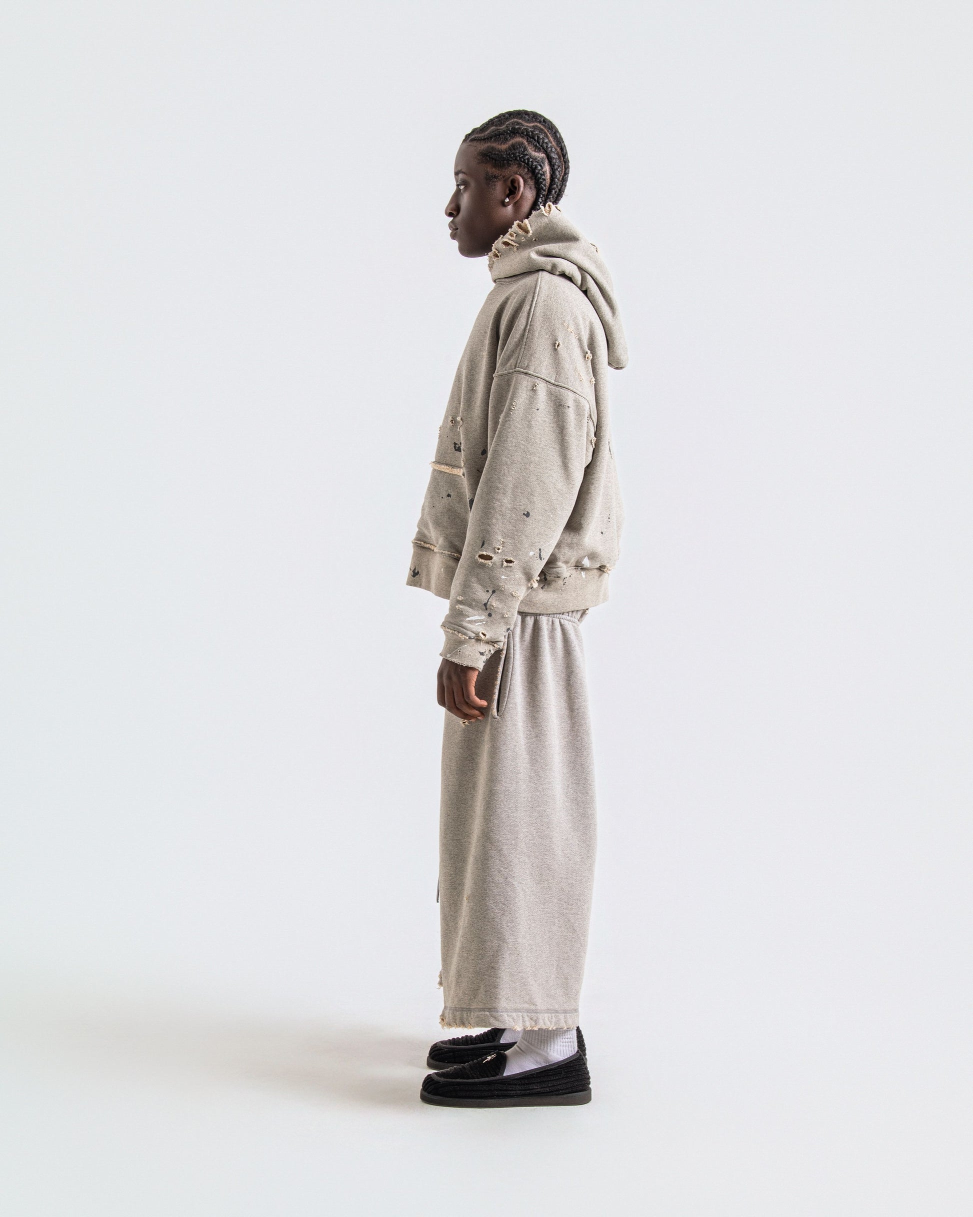 The second colorway of our 6/7 sweatshort capris — Heather Grey with the signature cropped fit and a new leather drawstring detail.