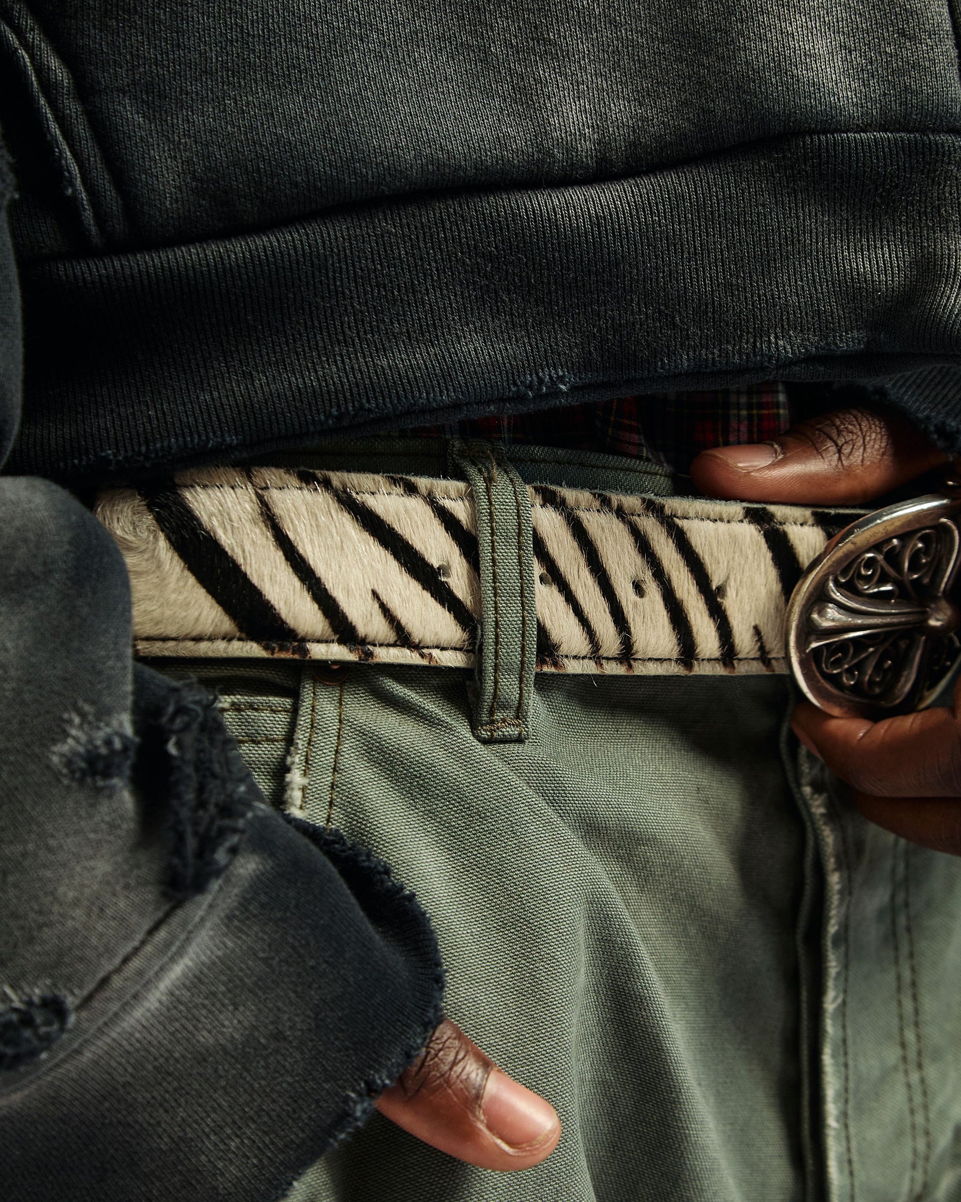 Hand-crafted, high-quality cowhide belt strap with a bold zebra print.